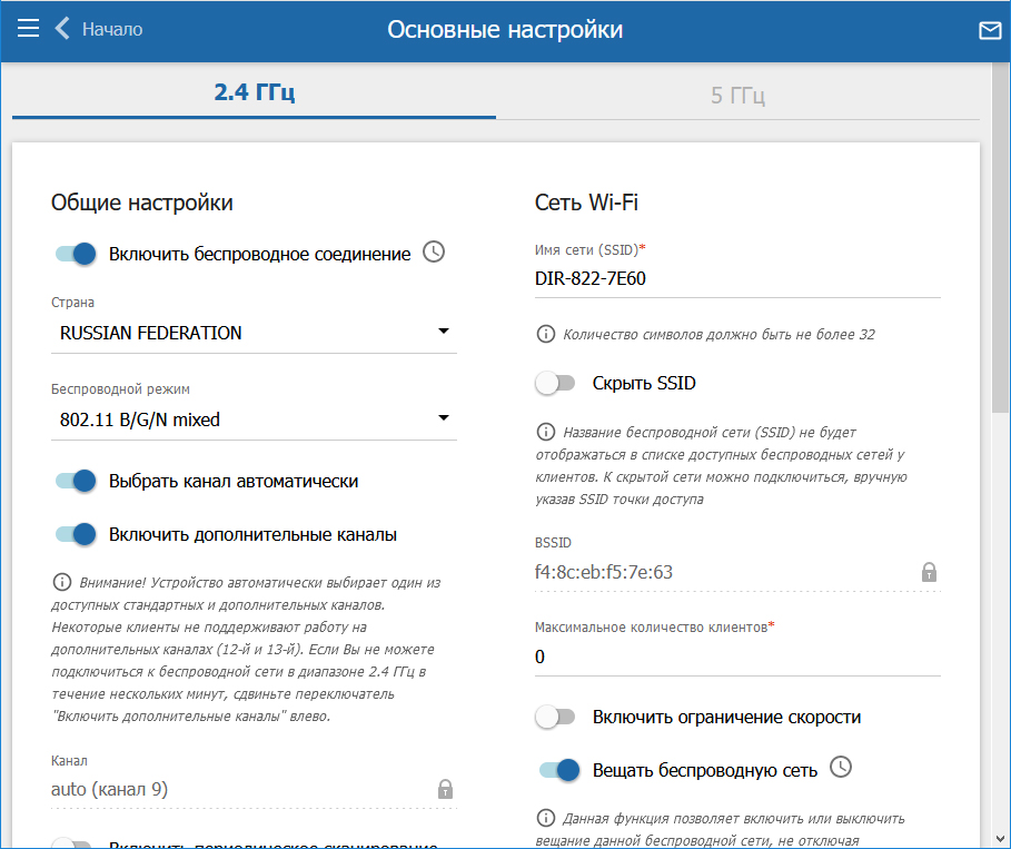 Выберем 2.4 ГГц, настройки для 5 ГГц аналогичны.