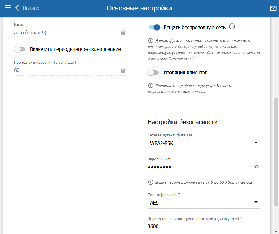 Пароль PSK - здесь вы задаете пароль на беспроводную сеть, требуется указать минимум 8 символов.
