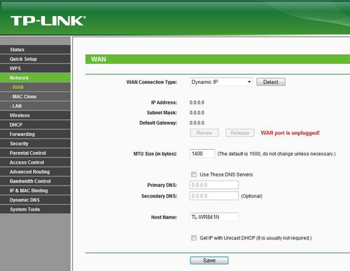 После того как вы выполните изменения на этой странице, нужно будет сохранить настройки, нажав на кнопку «Save» в самом низу страницы. Подождите 10-15 секунд и перезагрузите роутер обесточив его. После перезагрузки роутера, если нет необходимости настраивать беспроводную сеть, вы можете приступать к использованию сети интернет.