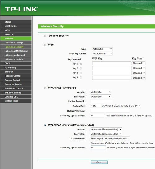 Перейдем к безопасности сети. Здесь мы зададим пароль на беспроводную сеть.