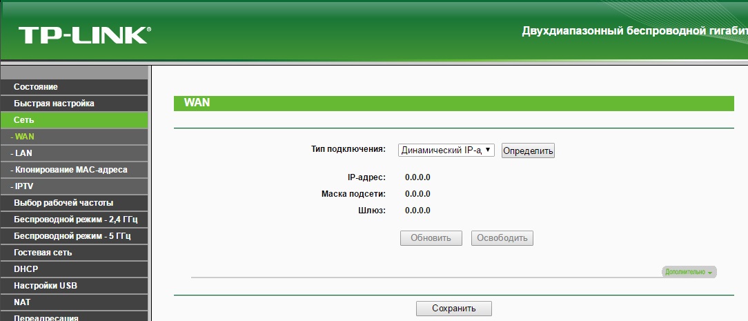 Тип подключения нужно выбрать «Динамический IP-адрес»