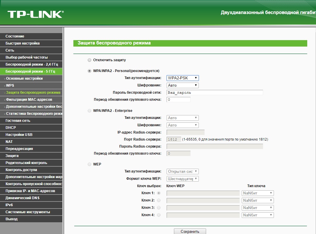 Перейдем к безопасности сети. Здесь мы зададим пароль на беспроводную сеть.