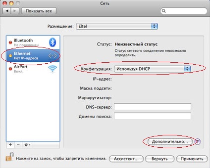 В появившемся окне в левом столбце подключений выберите активное подключение с названием Ethernet и в правой части (в которой отображается состояние подключения) нажмите кнопку Дополнительно.