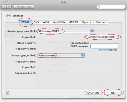 В открывшемся окне выберите вкладку TCP/IP. Напротив параметра Конфигурировать IPv4 выставите значение Используя DHCP. Напротив параметра Конфигурация IPv6 выставите значение Автоматически. Затем нажмите кнопку Запросить DHCP. По окончании всех действий нажмите в этом окне кнопку OK.