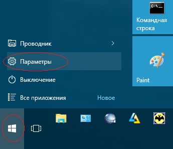 Нажмите на кнопку Пуск, далее выберите Параметры.