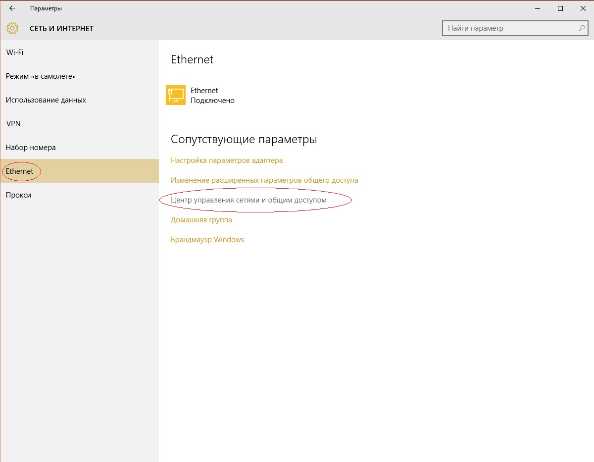 Выберите Ethernet в меню слева, далее выберите Центр управления сетями и общим доступом.