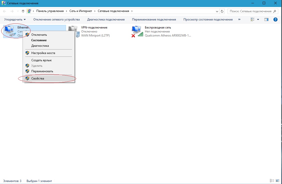 Нажмите на Подключение по локальной сети правой кнопкой мыши и в контекстном меню выберите Свойства.