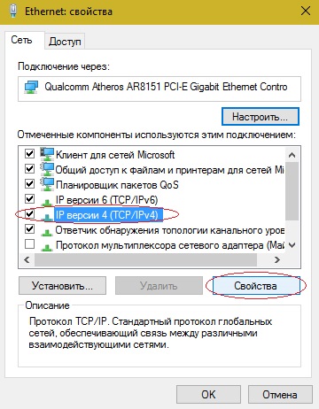 В списке протоколов найдите IP версии 4 (TCP/IPv4) выделите его и нажмите на Свойства.