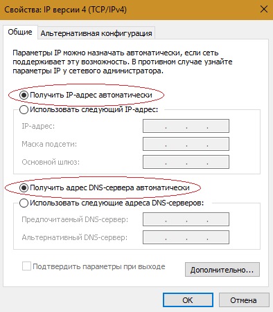 Проверьте, точки должны стоять на Получить IP-адрес автоматически и Получить адрес DNS-сервера автоматически